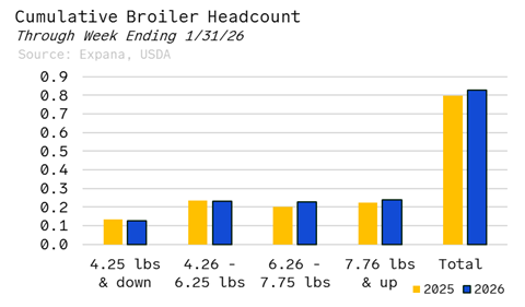 Early-year hatchery data continues to underscore the expansionary posture of the chicken industry. Across the opening stretch of the year, both egg sets and chick placements remain firmly above year-ago levels, reinforcing the industry’s long-standing YOY production growth trend. Egg sets for the first four weeks of 2026 ran 0.9% to 1.7% higher YoY, with each week establishing a new seasonal high. Chick placements have followed a similar trajectory, posting YOY gains ranging from 1.3% to just over 3.0%, further ...