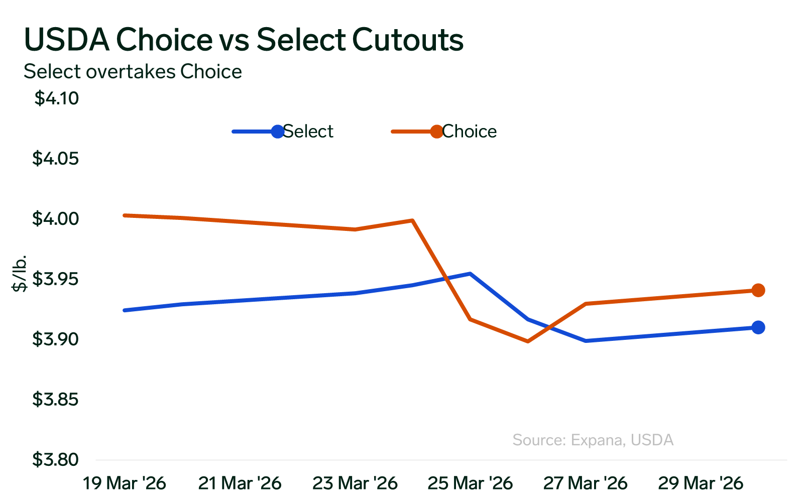 The data shows a brief and unusual inversion in the typical relationship between the USDA Choice and Select beef cutout values. At the same time, on March 25 and 26, the Expana Choice cutout maintained a premium over Select, holding at 3.35% on March 25 and 3.33% on March 26. Under normal market conditions, the USDA Choice cutout trades at a premium to the USDA Select cutout, reflecting higher quality and stronger demand. However, during the period from March 23 to...