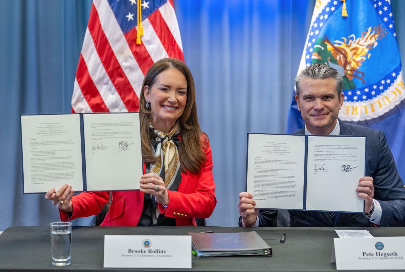 Today, U.S. Secretary of Agriculture Brooke L. Rollins and U.S. Secretary of War Pete Hegseth signed a Memorandum of Understanding (PDF, 92.7 KB) (MOU) that memorializes the relationship between the U.S. Department of Agriculture (USDA) and the U.S. Department of War (DoW) for the purpose of implementing the National Farm Security Action Plan (PDF, 1.2 MB)—an initiative that has delivered measurable results in just seven months.