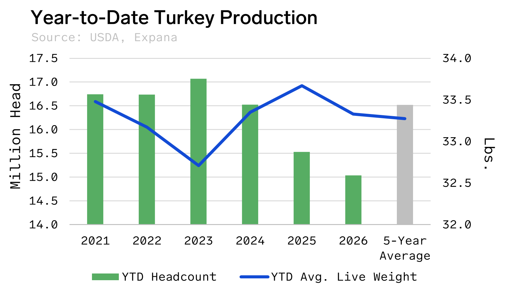 The turkey industry began 2026 with the lowest January harvest on record. At just 15.0 million head, the total sits 9.0% below the five year average, while average live weights were only 0.2% higher than the five year norm. Persistently low poult placements continue to signal constrained production potential in the months ahead, and a record low harvest to begin the year has amplified concern among market participants regarding near term supply availability.