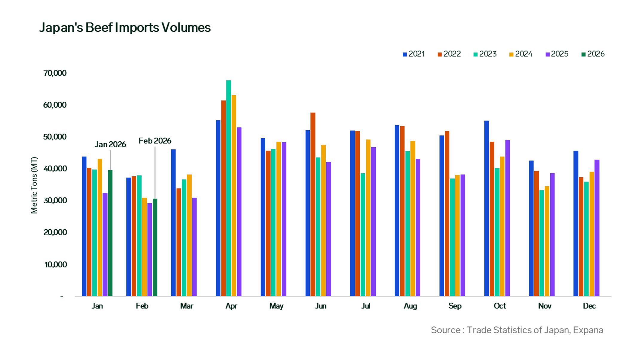 Japan’s beef imports fell to a 12-month low of 30,712 metric tons (MT) in February, according to the Trade Statistics of Japan.