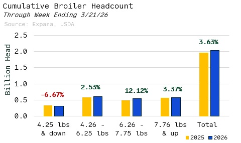 Through the week ending March 21st, U.S. broiler production remains firmly above year-ago levels, with total headcount now surpassing 2.04 billion, a 3.63% increase compared to 2025...