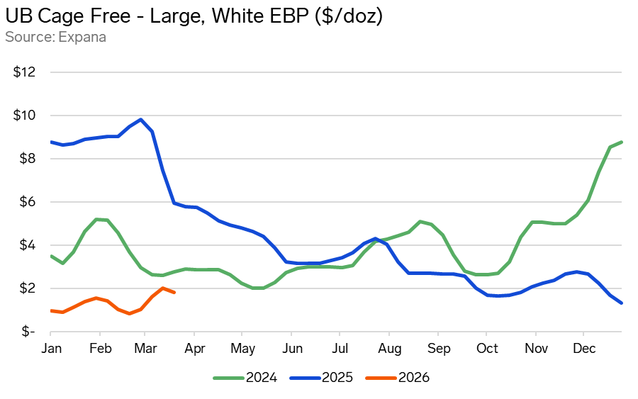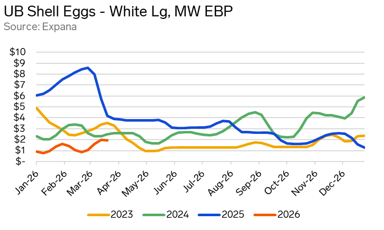 The contrast between last year’s egg market and current conditions could hardly be more pronounced. In the lead-up to Easter 2025 the industry was still firmly in the grip of an unprecedented supply shock. Highly Pathogenic Avian Influenza (HPAI) had decimated production through late 2024 and into early 2025, driving Expana’s benchmark Midwest large quotation to an all-time high of $8.58/dozen...