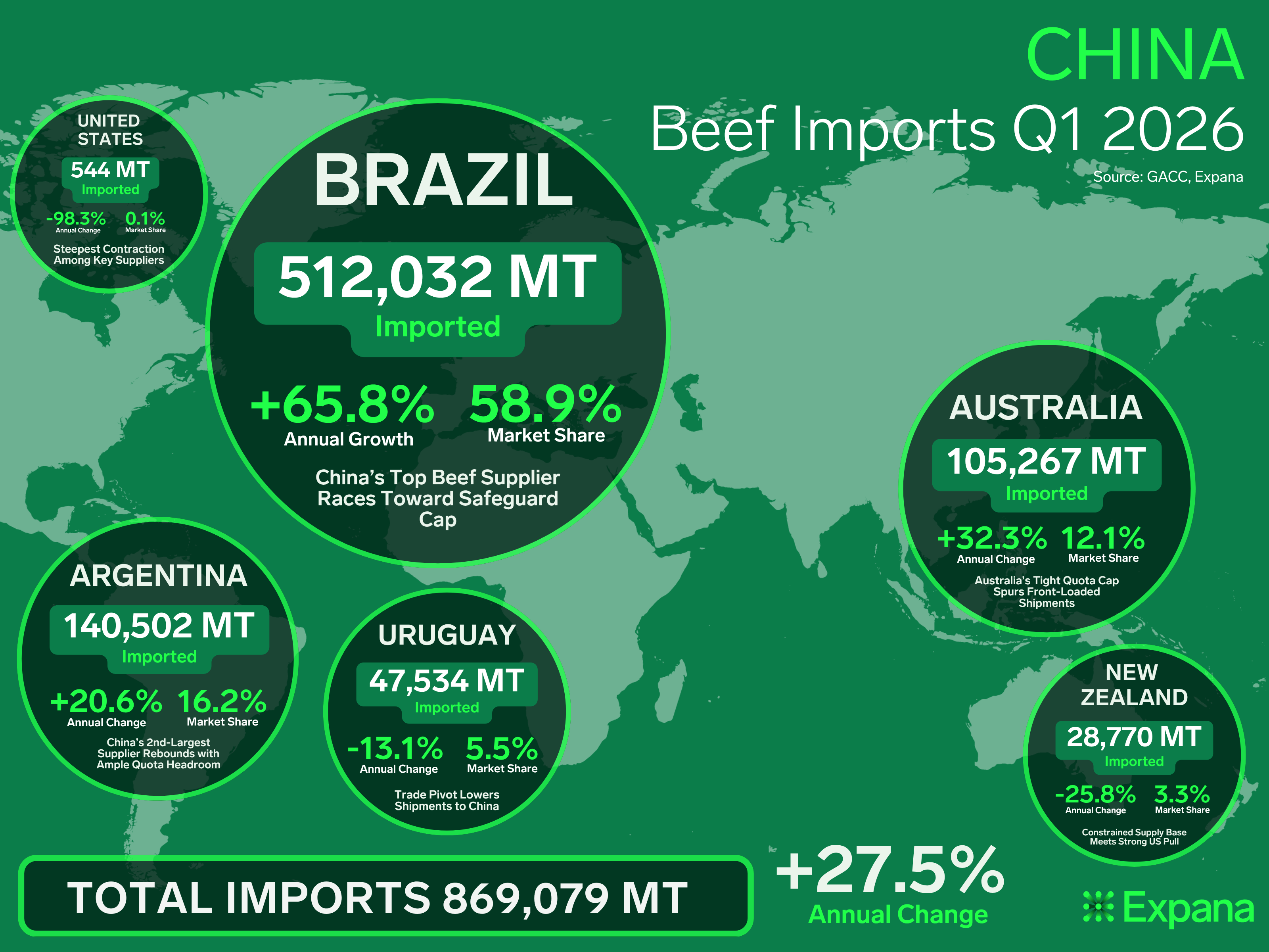 China’s total beef imports for the first quarter of 2026 reached 869,079 metric tons (MT), representing a 27.5% year-on-year (YOY) volume increase as major suppliers raced to beat newly implemented tariff cliffs.