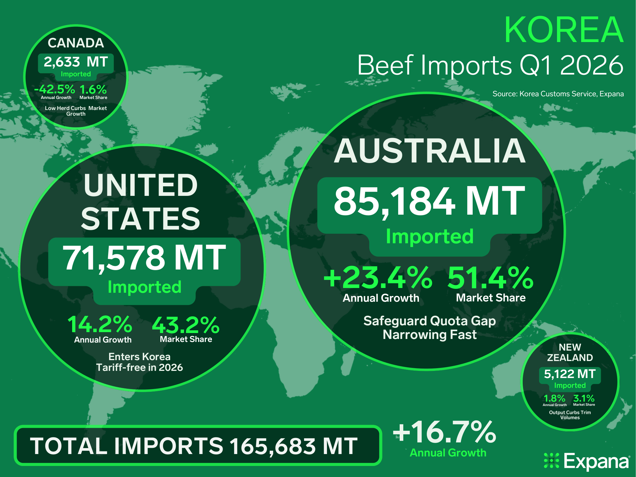 Korea’s total beef imports for the first quarter (Q1) of 2026 reached 165,683 metric tons (MT), representing a 16.7% year-on-year (YOY) increase, according to data from Korea Customs Service.