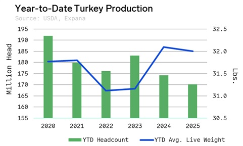 Cumulative turkey headcount has fallen 11.3% from 2020 levels and 2.4% from a year ago, with 2025 totals landing at 170.2 million, a new historical low. The accelerating year-over-year (YOY) decline...