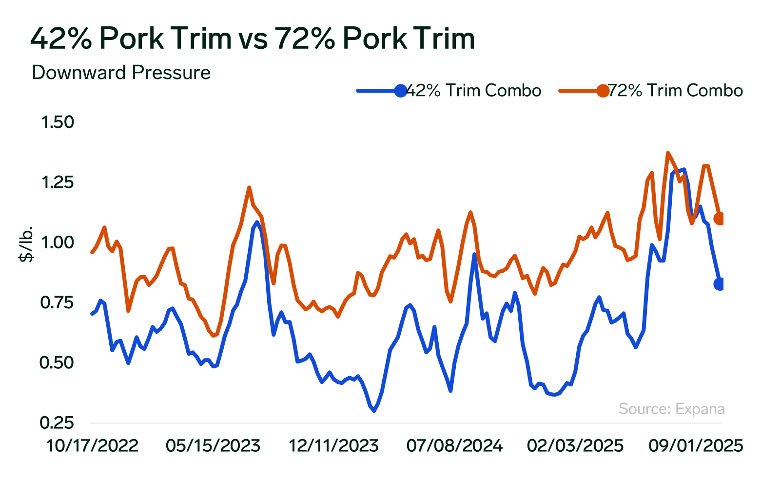 In October 2025, both fresh pork 42% trim and 72% trim values remain historically elevated for this time of year, though recent trading has shown softer tones as supplies improve on the spot market following summer. For the week ending October 13, 2025, 42% trim averaged $0.828/lb, while the 72% trim averaged $1.10/lb. Compared to this same week last year (October 16, 2024, at $0.717/lb for 42s and $0.928/lb for 72s), prices are higher by approximately 15.5% and 18.5%, respectively...