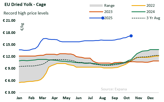 As of mid-October 2025, the EU egg product market is under severe strain, with prices for dried whole egg, liquid, and dried yolk hitting record highs. A year of elevated shell egg costs, limited supply, and minimal inventory buildup has left the market exposed just as demand surges for the peak consumption season.