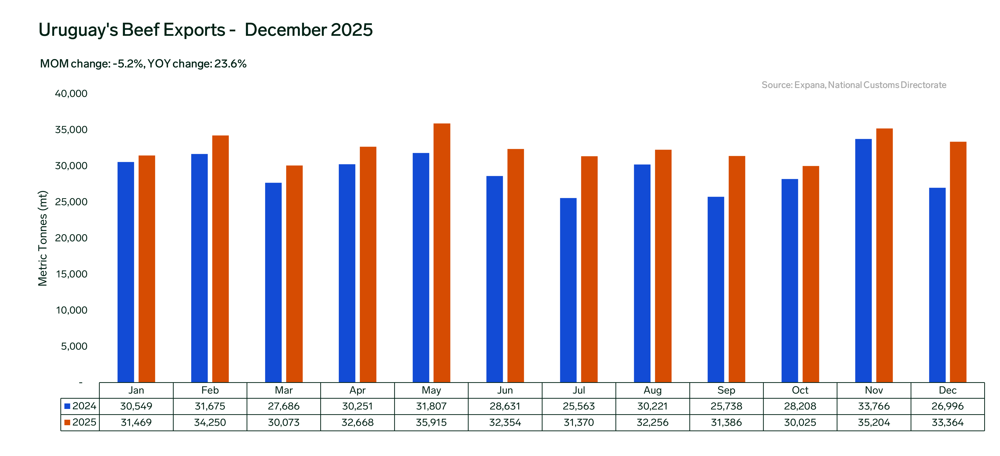 The latest data from Uruguay’s National Customs Directorate showed that fresh beef (chilled and frozen) exports totaled 33,364 mt in December 2025, declining 5.2% month-over-month (MOM) from November. Despite the monthly pullback, December volumes were 23.6% higher year-over-year (YOY), while 2025 shipments grew 11.2% to a total of 390,334 mt.