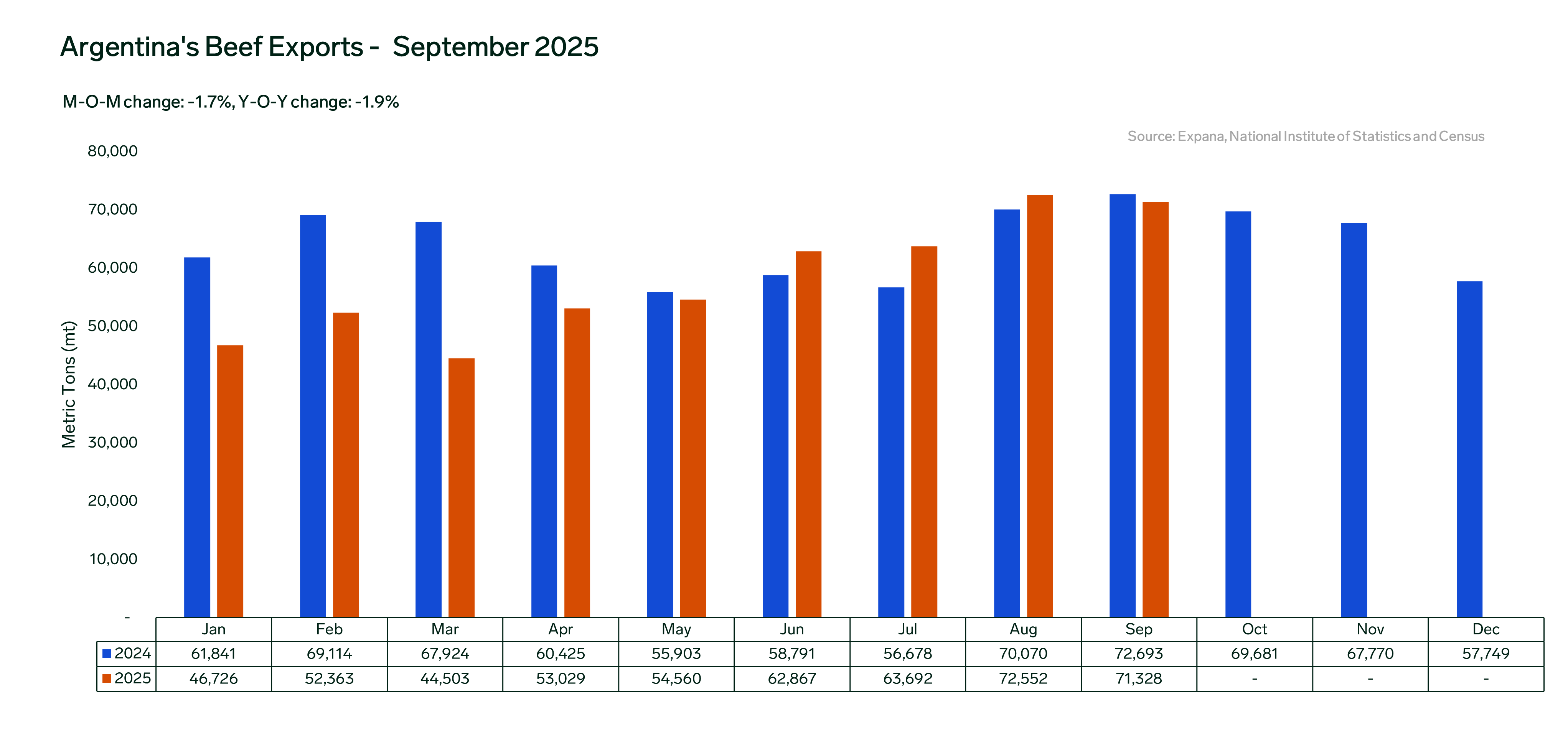 ANALYSIS: Argentina’s September 2025 Beef Exports Pulled Back 1.7% MOM to 71,328 mt