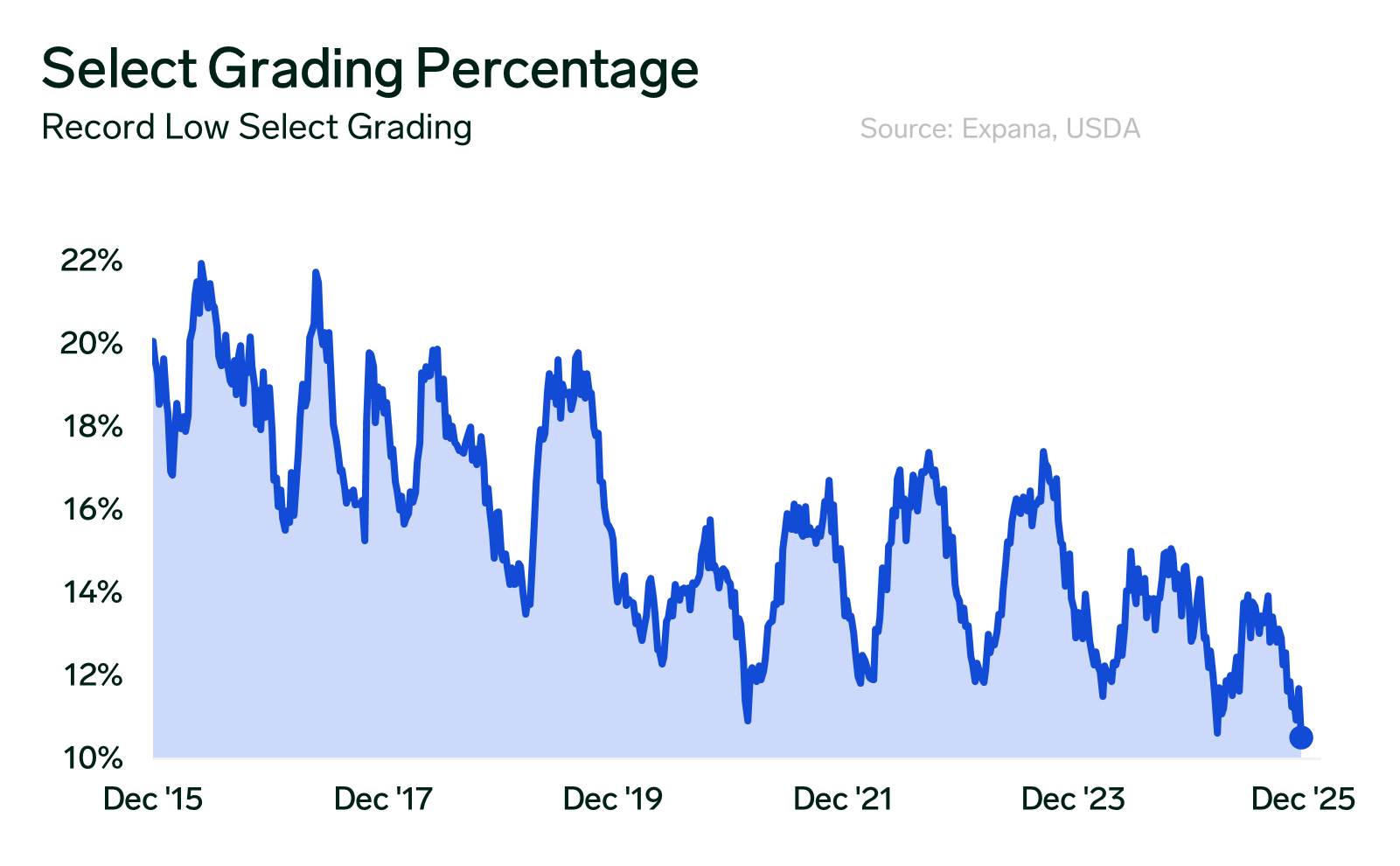 US Select grading percentages have dropped to record lows in 2025, highlighting a notable shift in cattle quality across the fed supply base. Throughout the year, Select grading has remained well below historical norms, hitting lows around 10.5% late in the year.