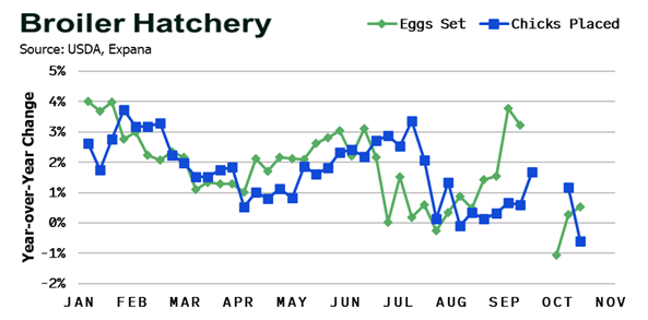 After considerable anticipation, the USDA has begun releasing updates to its hatchery report, and the latest data largely confirms what market participants have been expecting. For the week ending November 15th, broiler-type production showed mixed signals throughout October and early November. Weekly egg sets stood at 248 million, reflecting a modest 1% year-over-year (YOY) decline from 2024’s elevated levels, but still ranking among the highest seasonal readings on record.