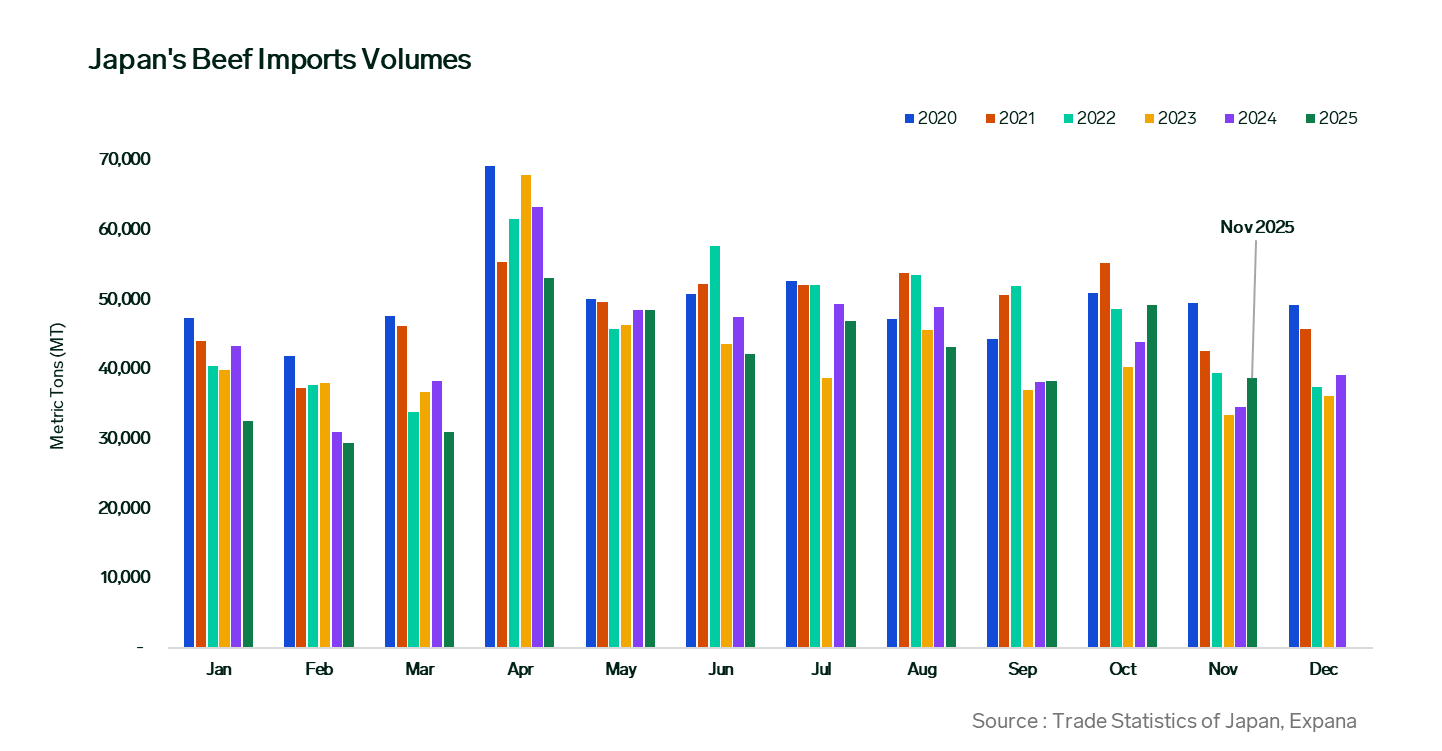 ANALYSIS: Japan’s Nov 2025 Beef Imports Contract from Six-Month Highs as Demand Cools