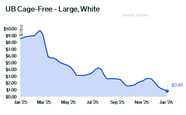 The US cage-free egg market continues to weaken, with the EBP rest-of-market quote dipping to $0.89/dozen this week—an all-time low since Expana began publishing daily assessments in January 2024. While demand dynamics have certainly contributed to the decline, the most significant driver has been the sharp rebound in production.
