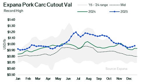 The Expana Pork Carcass Cutout value is tracking at a record high for December based on data dating to 2003. The current weekly value, which has followed a bullish trend throughout December, is 4.2% above the same time last year and 22.1% higher than the all-time average back to 2003.