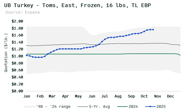 Whole turkeys are notably tight heading into November this year. While September’s USDA cold storage report has yet to be released, frozen holdings from March through August were situated at the lowest seasonal levels on record. Many processors are already reporting major shortages of production heading into the holiday season as the number of turkeys harvested year-to-date hovers at an all-time low...