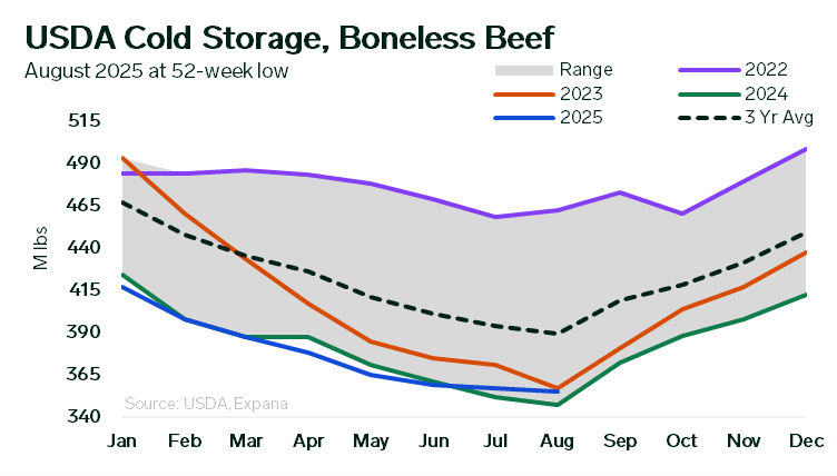 ANALYSIS: US Boneless Beef Cold Storage Stocks Hit 52-Week Low in August 2025Boneless beef stocks hit a 52-week low in the latest USDA Cold Storage report, with just 354.7 million pounds (M lbs) in freezers nationwide. This marks a modest month-over-month decline of 2.3 M lbs (-0.7%).
