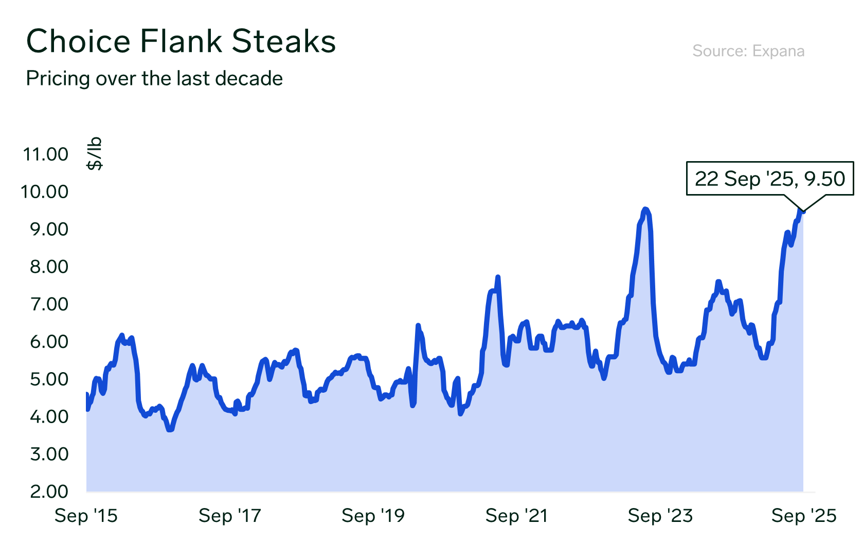 Flank steak prices typically decline as summer winds down and grilling season comes to a close, but 2025 has proven to be an exception. In September, weekly prices reached a historic high, surpassing the previous record set in 2023. Since August, values have reached their highest levels for this period in nearly four decades, surpassing all years back to 1985.