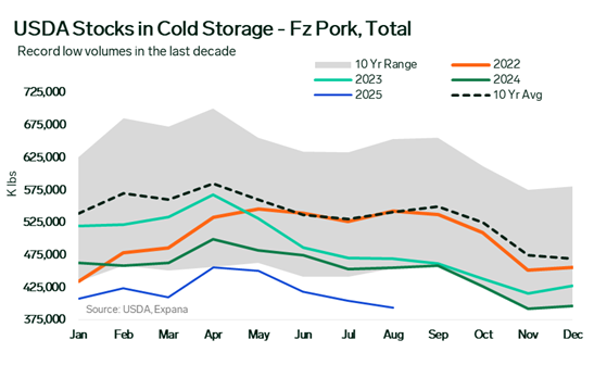 The USDA’s August Cold Storage report, released on Friday, reveals that frozen pork stocks have remained near 10-year lows throughout most of 2025, with several months registering inventories 10–20% below the decade-long average. This persistent shortfall reflects a combination of reduced hog slaughter and production volumes, driven in part by recent disease outbreaks, alongside the lingering impact of the Prop 12 implementation in 2024. Seasonal inventory patterns, characterized by spring and...