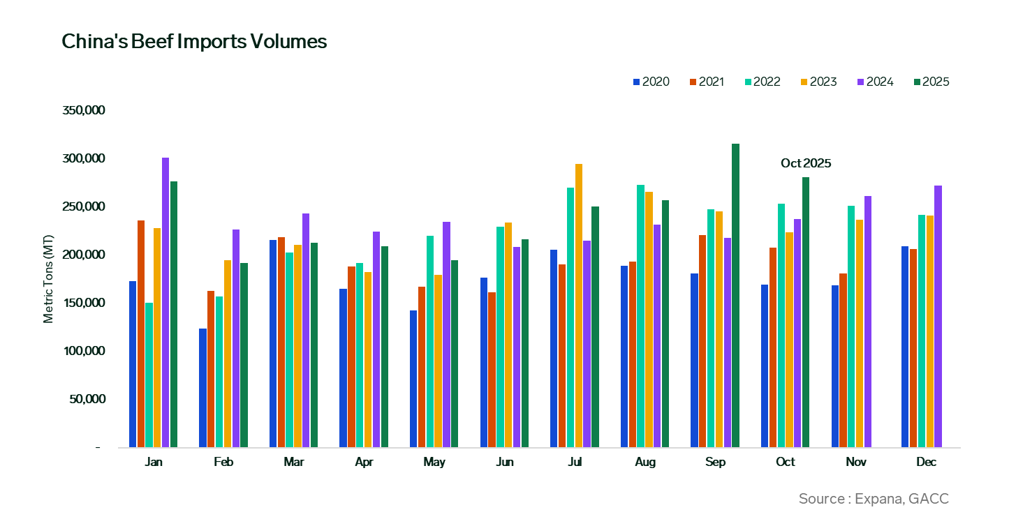 ANALYSIS: China’s Oct 2025 Beef Imports Retreat from Record Highs at 281,292 mt