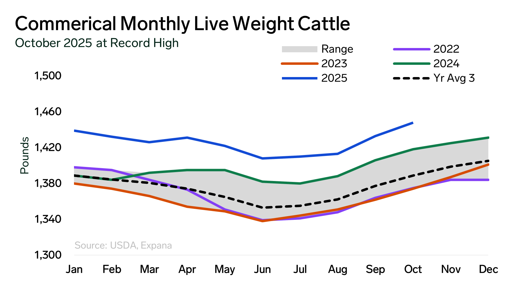 After starting the year with all-time-high average monthly live cattle weights of 1,439 lbs, average weights eased slightly through the spring and summer before moving higher again. October has now posted a fresh record at 1,448 lbs. Seasonally, weights tend to trend upward into late fall, with the possibility of a brief pullback in December depending on weather and marketing pace. The weekly estimated numbers from the USDA’s production report shows that figures will continue to increase for November, expected to be at...