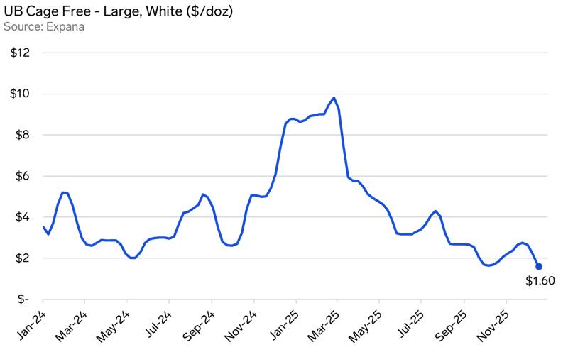 The cage-free market continues to soften as the industry moves closer to the Christmas holiday. Values have declined consistently in December, with cumulative losses now totaling $1.06/dozen, bringing the Rest-of-Market Cage-Free EBP down to $1.60/dozen. While it is not uncommon to see some seasonal easing as the peak holiday period concludes, this year’s pattern has been notably different. Ongoing repopulation efforts and persistent sub-par demand prevented any meaningful pre-holiday lift from materializing in the first...