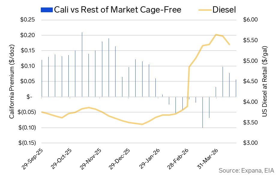 Freight costs have moved sharply higher in recent weeks, with the US Energy Information Association reporting the national diesel average at $5.403 per gallon, compared to $3.534 a year ago. This increase continues to influence how shell eggs.....