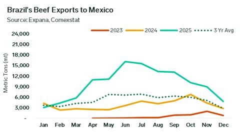 November data shows that Brazil’s beef exports to Mexico held at higher year-over-year (YOY) levels, even as volumes moved lower for a third consecutive month. Shipments peaked in September and then eased through October and November, reflecting a gradual adjustment from the mid-year highs. Despite this downward trend, the Mexican import market continued to rely on Brazilian product to supplement domestic availability. Participants reported that cattle movements inside Mexico remain limited, particularly for finished cattle moving from southern regions, as New World Screwworm inspections and controls...