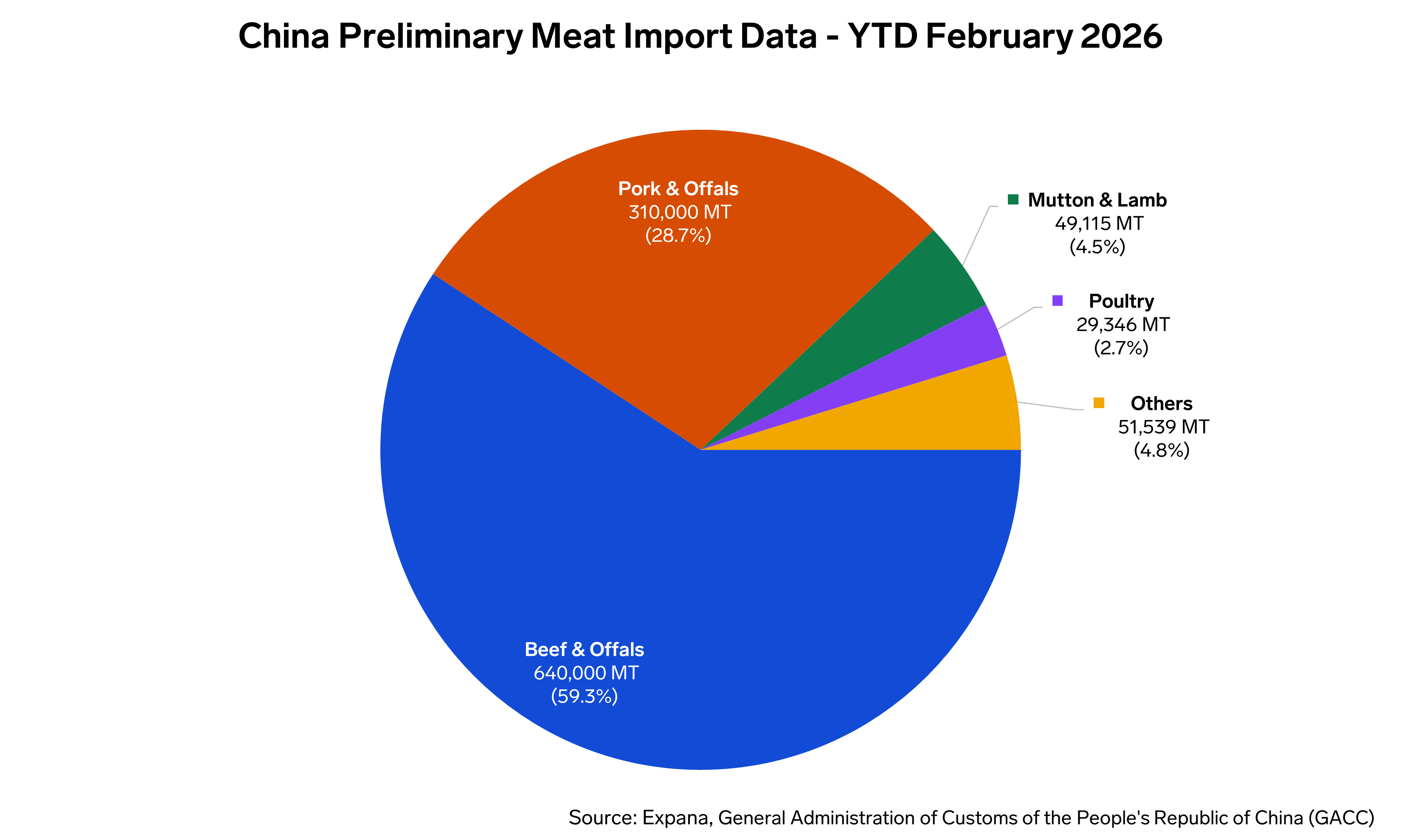 ANALYSIS: China’s Jan-Feb 2026 Total Meat Imports Dip 1.2% YOY to 1.08M MT