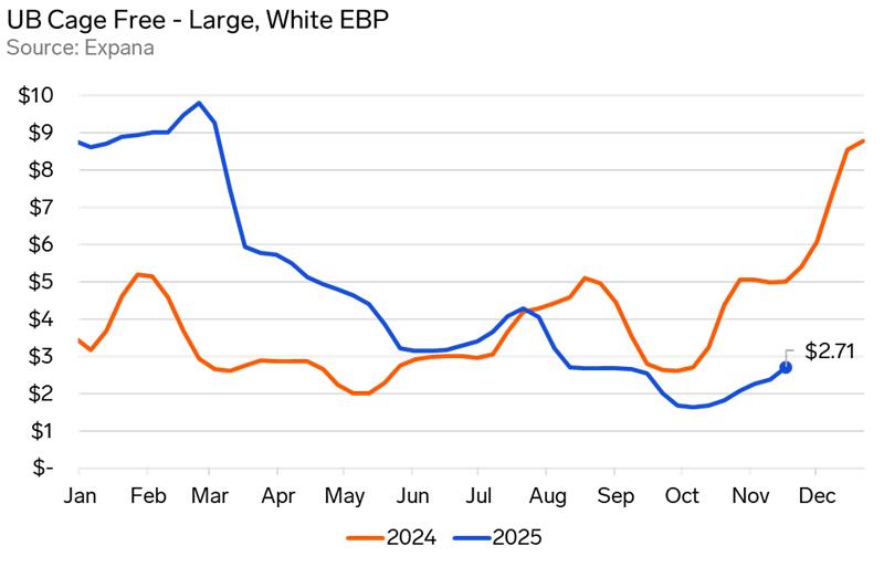 Cage-free wholesale values continued to rise this week as Thanksgiving baking demand surged across retail channels. Large national chains have maintained affordable shelf pricing through November, driving strong consumer sales as households prepare for the peak baking period. At some of these chains, cage-free eggs are positioned below $1.50/dozen—an uncommon and striking inversion that puts them roughly 50cts below conventional shelf prices in many other regions. In effect, shelf prices are trending lower than they were heading into Thanksgiving last year, supporting consistent foot traffic despite ongoing pressure on household budgets...