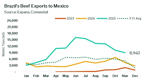 November data shows that Brazil’s beef exports to Mexico held at higher year-over-year (YOY) levels, even as volumes moved lower for a third consecutive month. Shipments peaked in September and then eased through October and November, reflecting a gradual adjustment from the mid-year highs. Despite this downward trend, the Mexican import market continued to rely on Brazilian product to supplement domestic availability. Participants reported that cattle movements inside Mexico remain limited, particularly for finished cattle moving from southern regions, as New World Screwworm inspections and controls...