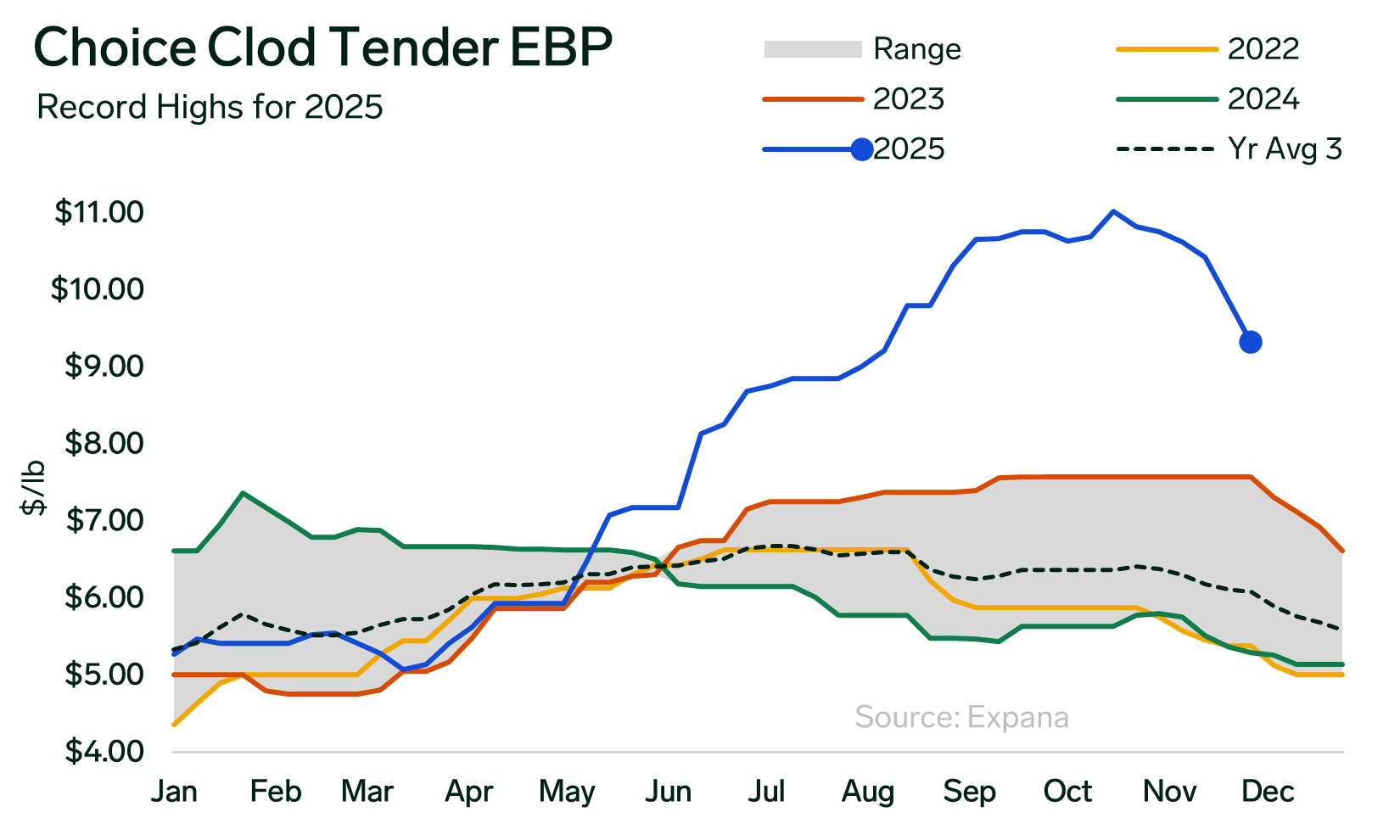The Choice clod tender has maintained record highs in 2025 compared with previous years, reaching a seasonal peak above $11.00/lb. Even after softening from mid‑October into late November, the current value near $9.32/lb remains well above the same period in 2022–2024, underscoring a firm pricing environment. This year’s price trajectory is a clear outlier, driven by active demand and notably constrained supplies.