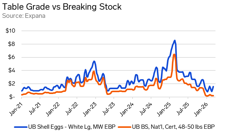 The relationship between Midwest large shell eggs and 48–50 lb. breaking stock has diverged sharply in recent weeks, producing one of the most unusual relative price relationships observed in the historical data set.